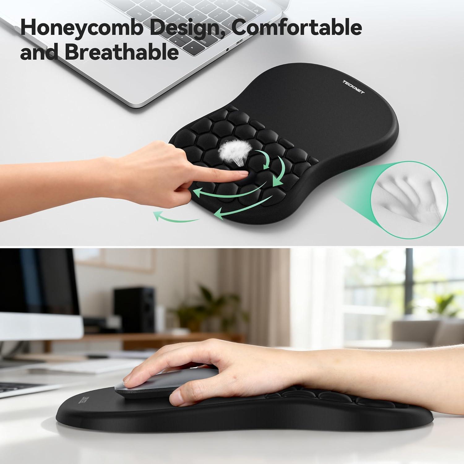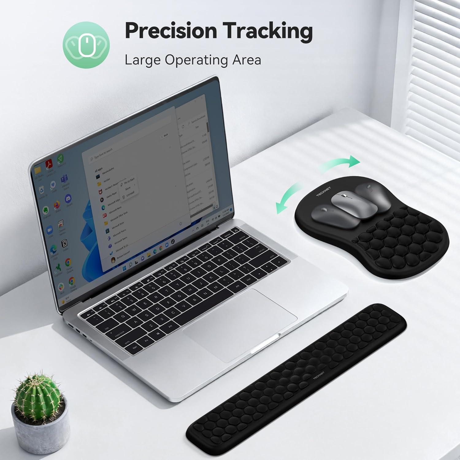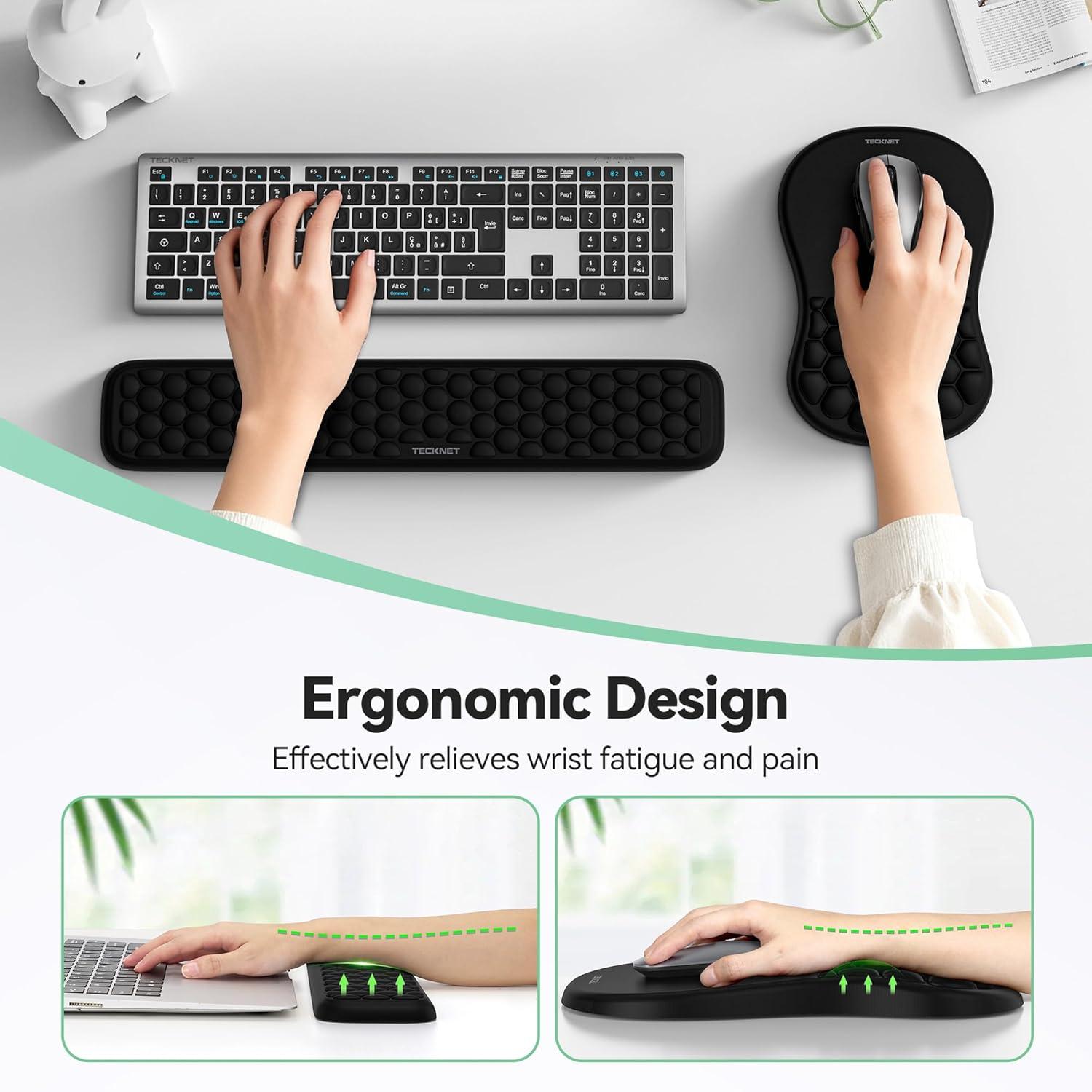 【Upgraded Massage Bump & Slope Design】Designed with textured massage bumps and an 8° front ergonomic slope, this wrist rest set enhances air circulation, prevents sweating, and delivers gentle pressure relief. The massage bead design naturally supports your wrist, easing discomfort and helping improve carpal tunnel symptoms caused by extended computer use.